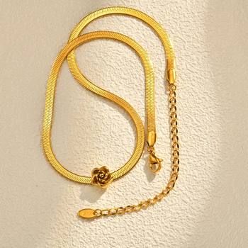 Collar de cadena de serpiente plana chapada en oro de 18 quilates, cadena de serpiente de acero inoxidable apilable, diseño de flor rosa a la moda