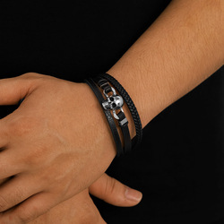 Joyería de individualidad Pulsera de punto de cuero Pu multicapa Hebilla magnética de color plateado Pulsera de calavera de acero inoxidable para hombres